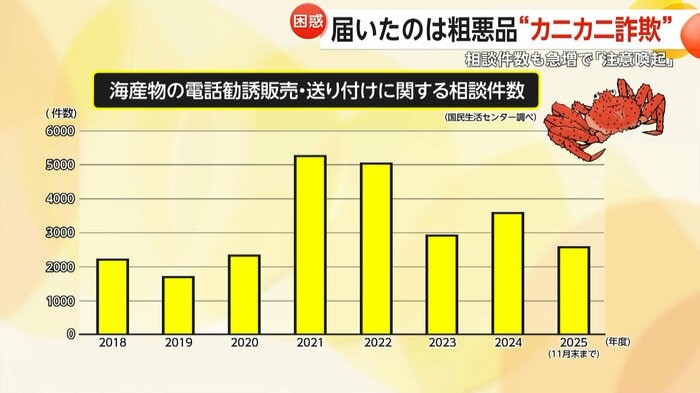送られてきたカニが、購入金額に見合わない身がスカスカな粗悪品だったり、勝手に代引きで送り付けられるという“カニカニ詐欺”。