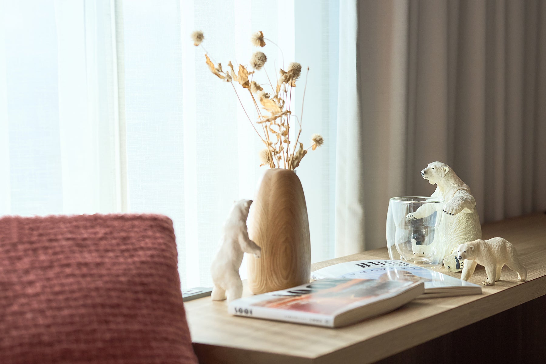 シロクマのぬいぐるみやモフモフのベッドカバー、シロクマモチーフの小物など、シロクマ好きにはたまらない空間! まるでシロクマと一緒に眠っているかのような気分を味わえます。