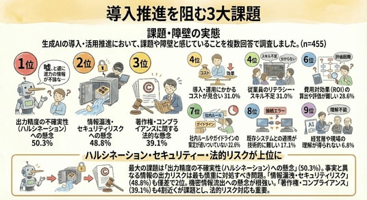 最大の課題は「ハルシネーション(50.3%)」。生成AIが事実と異なる情報を出力するリスクが、業務活用における最大の障壁として認識されています。セキュリティリスク、法的リスクと合わせ、技術的・組織的な対応の必要性が浮き彫りとなりました。