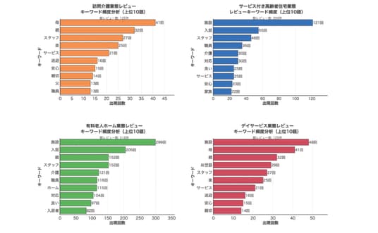 クチコミデータの分析の結果、介護サービスにおいてご家族が最も重視するのは「施設環境」と「スタッフの接遇」であり、その連携品質が評価を左右している実態が明らかになりました。