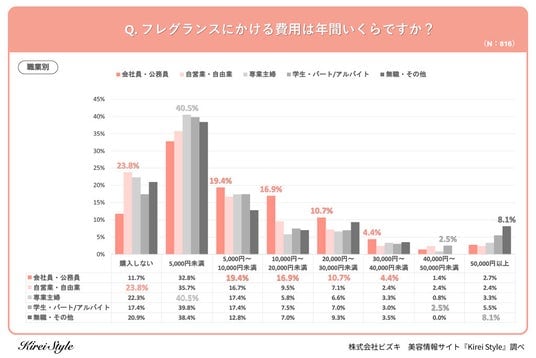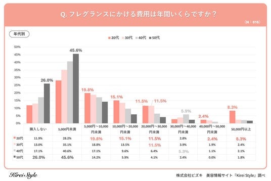 「今のキレイも、10年後の輝きも」をコンセプトに美容や健康にまつわる情報を発信する「Kirei Style(キレイスタイル)」の運用を行う株式会社ビズキは、事前調査で「フレグランスを1個以上所有している」と回答した全国の女性816人を対象にフレグランスに関するアンケートを実施し、年代別等の特徴についてまとめました。