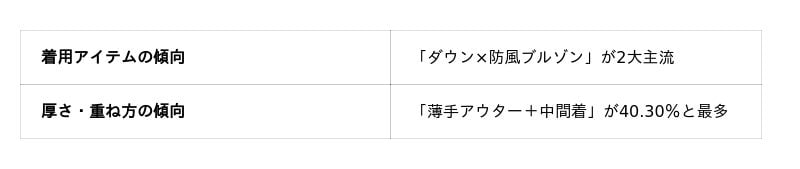 着用アイテムの傾向:「ダウン×防風ブルゾン」が2大主流