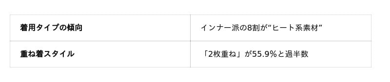 一方、インナー派は「動きやすさ」を優先している傾向が強いため、保温性に多少の妥協をしている層が多いと推察されます。