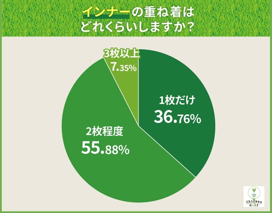 インナーの重ね着枚数を調査したところ、「2枚程度」が55.9%で過半数を占め、温度調整と動きやすさのバランスを意識するゴルファーが多いことが分かりました。