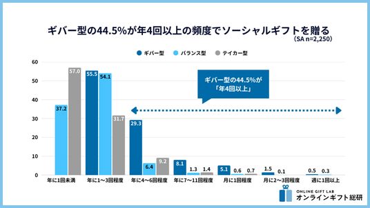1. ギバー型の44.5%が年4回以上の頻度でソーシャルギフトを贈る