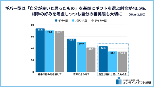また、ギフト選びにおいては「自分が良いと思ったものを」贈る割合が43.5%と、バランス型(34.9%)やテイカー型(34.5%)を上回る結果に。相手の好みを考慮しながらも、自分の価値観や審美眼を大切にする"贈り上手"の姿勢が浮き彫りになりました。