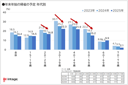 ・年末年始の予定は「予定なし」が増加し60.2%に。帰省は2年連続減少し、50代以下は全年代で低下