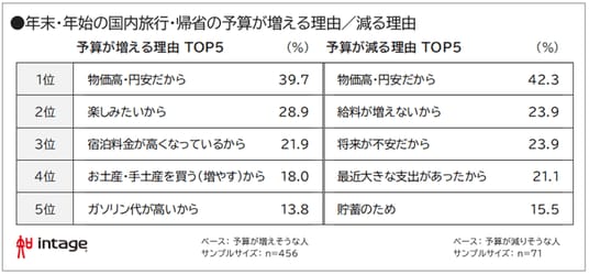 ・国内旅行、帰省の予算は微増(前年比103%)も、増える理由、減る理由いずれも1位は「物価高・円安」