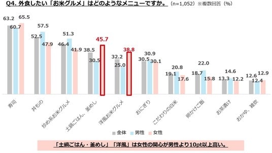 ・外食では「寿司」「丼」「炒め系」が上位。「土鍋ごはん・釜めし」「洋風」は女性の関心が男性より10pt以上高い。