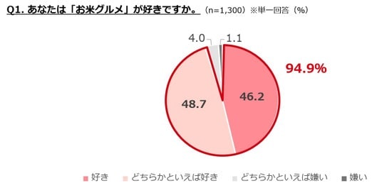 ・お米グルメが好きな人は95%。週1日以上食べる人は8割にのぼり、女性が男性を上回る。