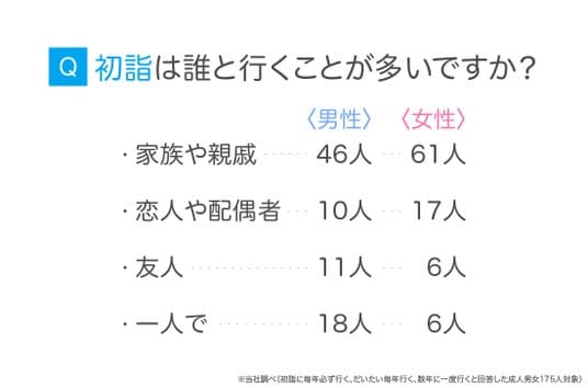 目的は「新年の行事として楽しむため」が最多で、同行者は「家族や親戚」、参拝時期は「三が日」が中心となっています。
