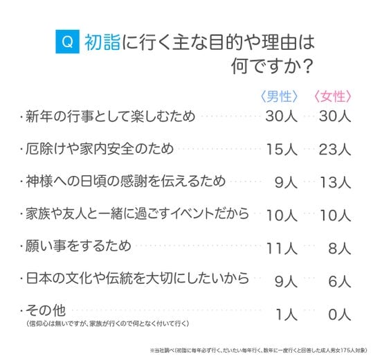 次いで、「厄除けや家内安全のため」「神様への日頃の感謝を伝えるため」が続き、初詣がイベント性だけでなく、祈願や感謝の場としても重視されていることがうかがえます。