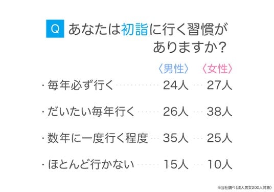 本調査では、初詣に行く習慣がある人は約6割となり、初詣が現在も多くの人にとって新年の恒例行事として定着していることが確認されました。