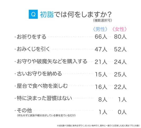 初詣で行うことを尋ねたところ、「お祈りをする」が男女ともに最も多く、次いで「おみくじを引く」が続きました。