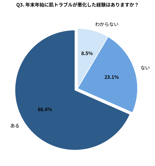 その結果、68.4%の方が「ある」と回答しました。年末の忙しさで肌ケアが後回しになることと、実際の肌トラブル悪化には密接な関連があることが示唆されました。