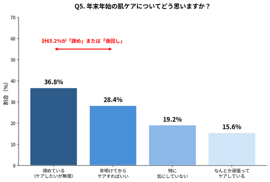その結果、「諦めている(ケアしたいが無理)」が36.8%で最も多く、次いで「年明けてからケアすればいいと思う」が28.4%でした。合計65.2%の方が年末年始の肌ケアを「諦め」または「後回し」にしている実態が明らかになりました。