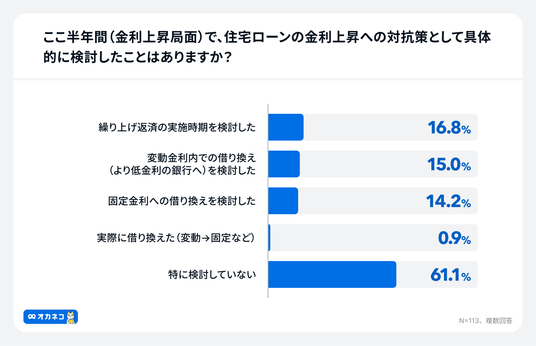 これほど高い金利上昇リスクの認識があるにもかかわらず、「ここ半年間(金利上昇局面)で、住宅ローンの金利上昇への対抗策を具体的に検討したか」という問いに対し、61.1%が「特に検討していない」と回答しました。検討した行動としては、「繰り上げ返済の実施時期を検討した」16.8%、「変動金利内での借り換え」15.0%、「固定金利への借り換え」14.2%が続く結果となりました。