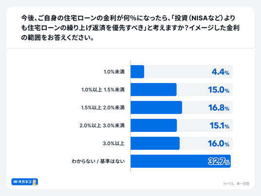 今後、ご自身の住宅ローンの金利が何%になったら「投資(NISAなど)よりも住宅ローンの繰り上げ返済を優先すべき」と考えるか尋ねたところ、「わからない/基準はない」が32.7%で最も多い回答となりました。これは、多くの人が損益分岐点の計算や明確な基準を持てていない実態を示しています。