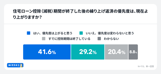 また、「住宅ローン控除(減税)期間が終了した後の繰り上げ返済の優先度は、現在よりも上がるか」については、41.6%が「はい、優先度は上がると思う」と回答しており 、控除のメリットがなくなるタイミングで行動を検討する層が多いことがわかります。