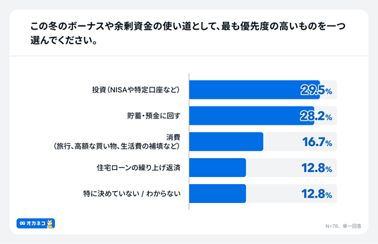しかし、この「定説」とは裏腹に、ボーナス受給予定者へ、冬のボーナスや余剰資金の使い道として最も優先度の高いものを尋ねたところ、「投資(NISAや特定口座など)」が29.5%で最多となり、「貯蓄・預金に回す」28.2%が僅差で続きました。