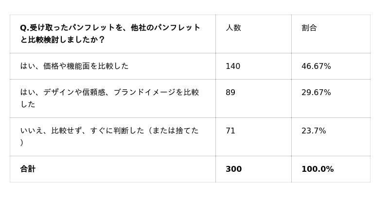 実際に、回答者の58.33%がパンフレットからWebにアクセスしていることからも、パンフレットは「情報の全て」ではなく、「Webサイトや動画へのアクセスを促す強力な導線」としてデザインされるべき時代に入っていることが推察されます。