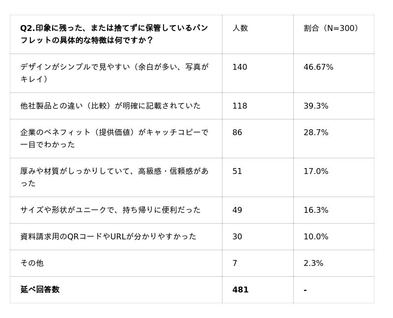 さらに、Webとの連携やサイズ感といったデザイン要素が、パンフレットの生存率と次の行動(問い合わせ)に大きく影響していることが推察されます。