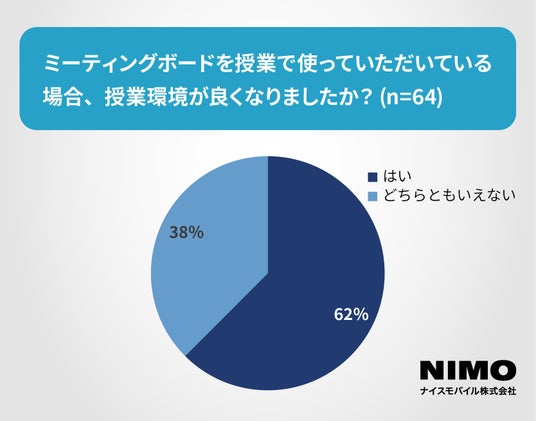 ITで会議DXを支援するナイスモバイル株式会社(本社:長野県松本市 代表取締役社長:高学軍)は、MAXHUB「All in One Meeting Board V6 CFシリーズ」(以下、ミーティングボード)の営業活動に使用していたデモ機をメンテナンスし、全国の小学校から大学、教育委員会等の教育機関に計100台寄贈を実施しました。2024年11月から順次寄贈し、設置から3か月が経過した時点での活用状況や、GIGAスクール構想の現状を把握するため、寄贈先を対象にアンケート調査を実施。調査の結果、回答のあった71件のうち、ミーティングボードを授業で活用していると回答のあった64の教育機関のうち 40件が「教育活動の環境が良くなった」と回答し、「良くならなかった」とする否定的評価は 0件。導入後3か月で約62%の教育機関が教育環境の改善を実感するという結果となりました。今後の教育活用に対する意識も明らかになり、回答のあった71教育機関のうち約68%が「教育を活用した先進的な取り組みを行いたい」、約62%が「大学や企業とオンラインで連携し、学びの機会を広げる取り組みに興味がある」と回答が得られました。