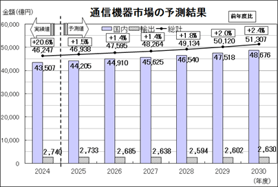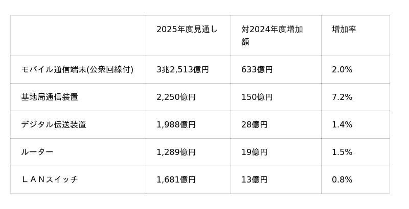 2025年度の通信機器の需要総額は4兆6,938億円(前年度比1.5%増)、そのうち国内は4兆4,205億円(同1.6%増)、輸出は2,733億円(同0.2%減)と予測しました。2024年度と比較し増加が予測される主な機器を記載(増加額が大きい順)