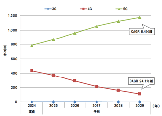 - 世界の携帯電話(スマートフォン含む)市場は、先進国を中心に5Gサービスが普及しており、2025年以降はより広範囲に5Gサービスが展開されるようになると想定されます。通信方式別では、今後発売されるスマートフォンの多くが5G対応になると予測されることから、5G対応のスマートフォン市場は拡大します。一方で、5G非対応のスマートフォン市場は、3Gからの移行需要は一定程度残るものの、5Gへの置き換えが急速に進んでおり、縮小すると予測しました(図表3.)。