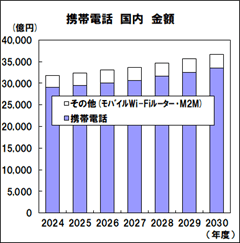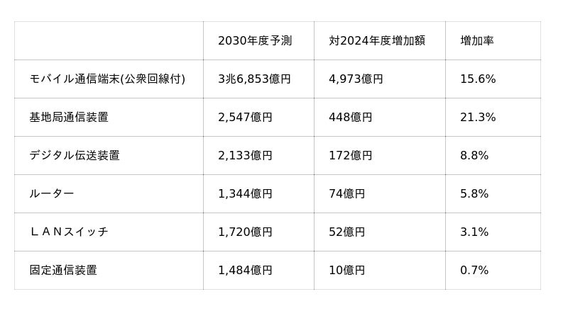 2030年度の通信機器市場の総額は5兆1,307億円(2024年度比10.9%増、CAGR 1.7%)、国内金額4兆8,676億円(同11.9%増、CAGR 1.9%)、輸出金額2,630億円(同4.0%減、CAGR -0.7%)と予測しました。2024年度と比較し伸びが予測される主な機器を記載(増加額が大きい順)