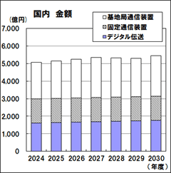 - デジタル伝送装置と基地局通信装置は、トラフィック増加や5Gの特徴を活かしたサービス拡大への対応に向けた需要があるため、国内需要は増加すると予測しました。地上系固定通信装置は、官公庁向け防災関連の予算が一定程度編成されており、加えて基幹系通信向けでは、5Gのエリアカバー率の向上及びSA方式の普及により、無線バックホール、フロントホール向けの需要があることから増加する見通しです。衛星系固定通信装置も、官公庁需要を中心に増加する見込みです。
