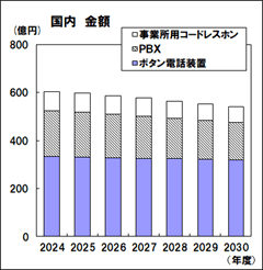 - ボタン電話装置・PBX・事業所用コードレスホンは更新需要が中心であり、これらの機器への投資は、ワークスタイルの変化により、新たなコミュニケーションスタイルへの投資にシフトされつつあります。単価は上昇傾向にある中で、企業のコミュニケーション基盤再構築の緩やかな進展による台数減少があるため、減少すると見込んでいます。