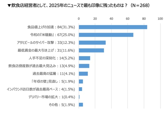 ■飲食店経営・運営者が2025年のニュースで最も印象に残ったのは「食品値上げの加速」まず、2025年のニュースで最も印象に残ったものを聞いたところ、最も多かった回答は「食品値上げの加速」(31.3%)で、次いで「令和の『米騒動』」(25.0%)、「アサヒビールのサイバー攻撃」(12.3%)という結果に。「コスト」「仕入れ」といった日々の店舗運営に直結する内容が上位にランキングする結果となりました。