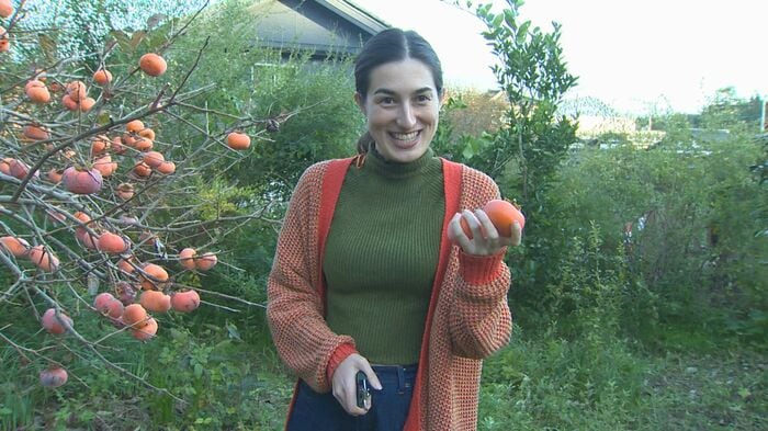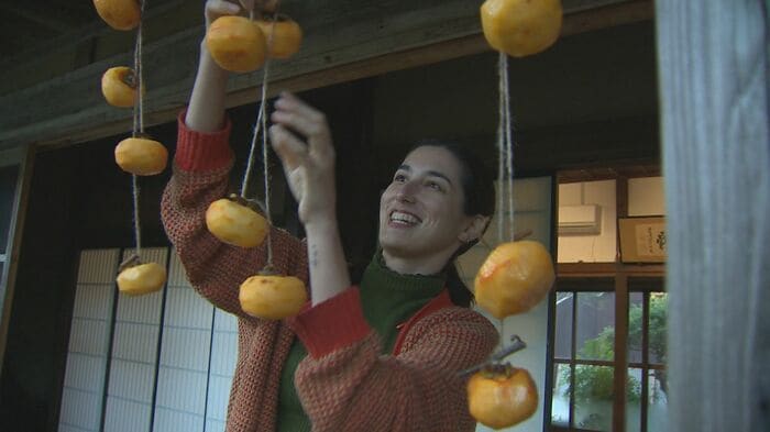 「裏庭でとれたこの柿を干し柿にしたい」と意気込むアニーさん。初挑戦にも関わらず、収穫に一切迷いがない。