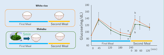 これまでのカネリョウ海藻と和洋女子大学との共同研究において、食事の前に水溶性食物繊維を多く含むめかぶの摂取、すなわち、「めかぶファースト」の実践が、1.食後の血糖値の上昇を抑制する、2.血中のGLP-1(グルカゴン様ペプチド-1)濃度を高め長時間持続することを明らかにしております。