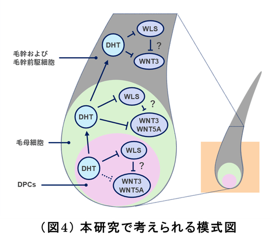 毛幹プロテオームおよび培養細胞を用いた研究により、DPCsのみならず様々な細胞がDHTの影響を受けていることが示唆されました(図4)。今後は、遺伝子レベルでの変化に加えて、各細胞にDHTを添加した際の培養上清液中WNT分泌量で評価することで、WLS発現低下によるWNT分泌の効率低下を確認し、これらの変化によるAGAへの寄与を解明することを目指していきます。