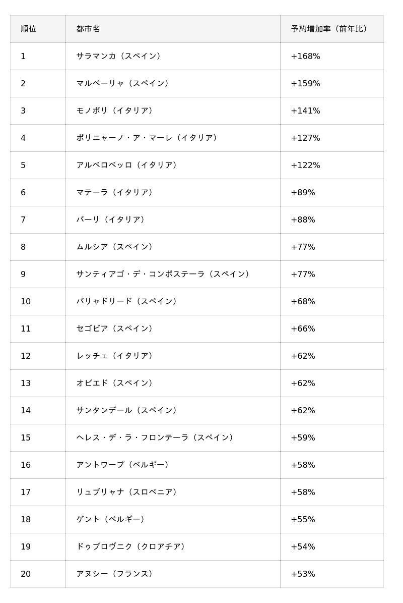 コスパの良さと「その土地ならでは」の体験を求め、地方都市への関心が高まるスペインやイタリアの第二の都市が多数上位にランクイン