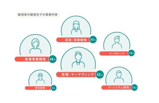 越境先での業務内容を見ると、越境がより幅広い層に開かれたフェーズに入っていることがより鮮明になります(図3)。営業・マーケティング、新規事業開発、経営・事業戦略といった事業の中核領域をはじめ、IT・システム開発やコーポレート領域など、越境のフィールドは幅広く広がっています。