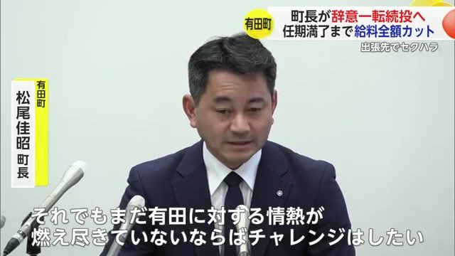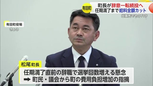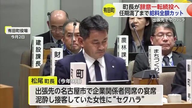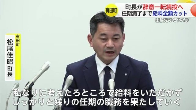 出張先でセクハラ行為をしたとして辞職の考えを示していた佐賀・有田町の松尾町長が「選挙にかかる費用」などを理由に一転、辞意を撤回した。来年1月から任期満了までの給料を全額カットし町長を続けるとしている。