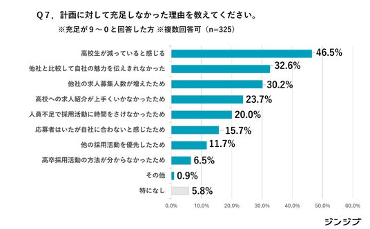 計画に対して採用が充足しなかった理由として最も多かったのは、「高校生が減っていると感じる」で46.5%に上り、少子化による母集団の縮小が大きな要因と考える人が多いです。