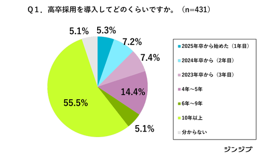 一方で、「2023年卒から」「2024年卒から」「2025年卒から」と、ここ3年以内に導入したのは19.9%で、昨年度に続いて新たに高卒採用に取り組む企業は増加傾向にあると言えます。(※)