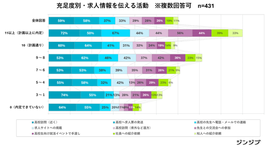 計画通りに採用充足できたと回答した方ほど、「高校訪問(近く)」「先生へ電話・メールで連絡」「先生との交流会」といった、学校との直接的な接点づくりに積極的でした。