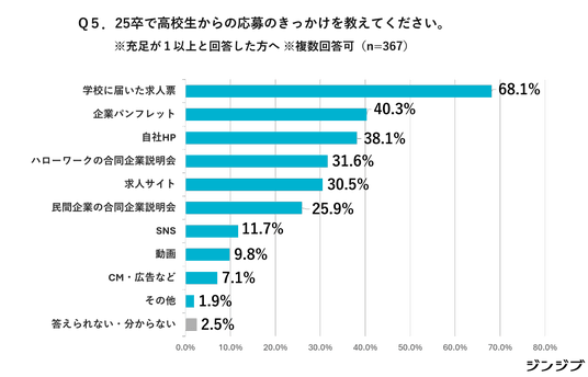 25卒高校生の応募のきっかけで最も多かったのは「学校に届いた求人票」(68.1%)でした。依然として学校経由の紹介が高卒採用の中心的なルートであることがわかります。