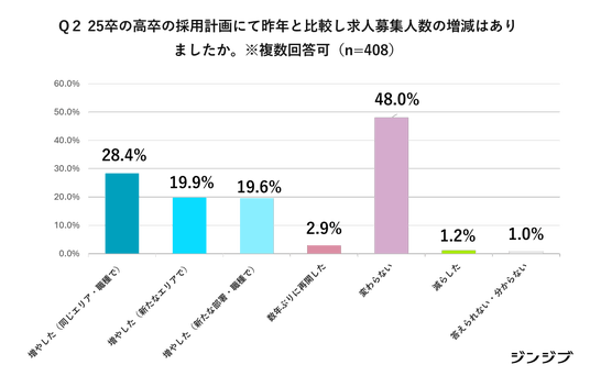 25卒の高卒採用の募集人数は「変わらない」の回答が48%と最も多く、前年と同水準の採用計画の維持が半数近くを占めます。