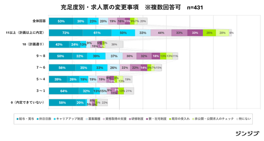 求人票の変更事項で比較すると、もっとも多かったのは「給与・賞与」でしたが、採用充足度との関係を見ると給与改善だけが成功要因ではないことがうかがえます。