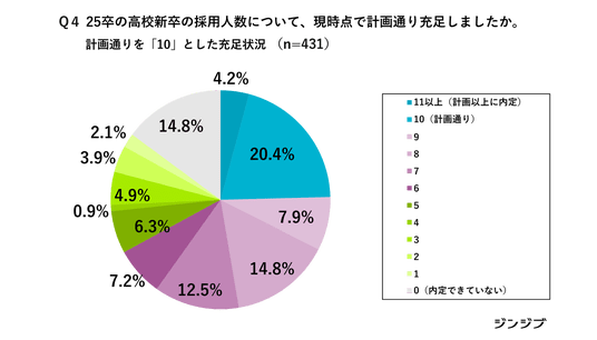 25卒の高卒採用の現在の採用結果については、「計画通りに充足した」(20.4%)、「計画以上に採用できた」(4.2%)と、全体の約4分の1近くが計画を達成または上回る結果となりました。