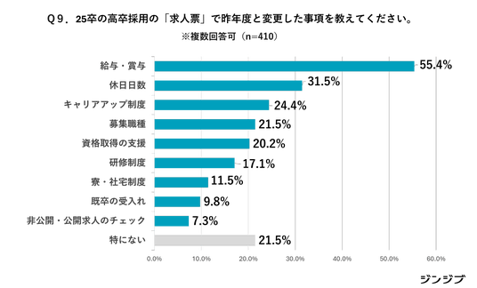 一方で、「特にない」と回答した企業は21.5%でした。昨年の回答33.8%に比べ減少していることから、高校生の応募意欲を上げるために募集要項を見直した企業は増えていると言えます。
