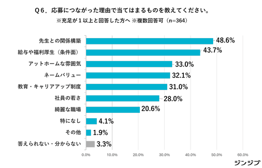 次いで「給与や福利厚生などの条件面」(43.7%)が多く、安定した待遇への関心も高いことが示されています。さらに「アットホームな雰囲気」(33.0%)や「ネームバリュー」(32.1%)、その他「教育・キャリアアップ制度」(31.0%)、といった項目も上位に入り、企業の魅力や職場環境が応募の後押しになっていると考えられます。
