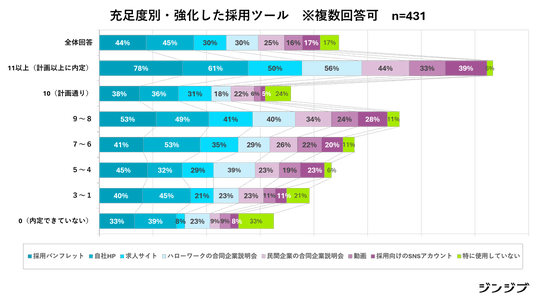 一方で採用ツールでは、「採用パンフレット」「自社サイト」「ハローワークの合同企業説明会」「求人サイト」の実施割合が多く、充足度が高まるほど採用活動や採用ツールは複数用意しています。