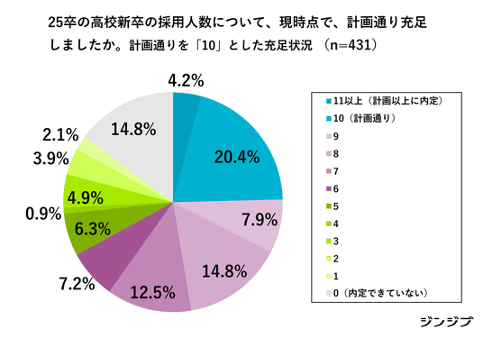 一方で、75.4%の企業は計画未達であり、高校新卒の採用が依然として厳しい状況が続いています。「8~9」と目標に近い水準まで採用が進んだ企業もあるものの、充足度が「5以下」が18.1%、「内定できていない」が14.8%と採用結果に差が出ています。